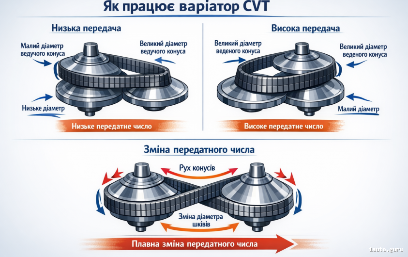 Конуси змінюють діаметр, а ремінь рухається між ними, забезпечуючи плавну зміну передатного числа. Саме тому розгін у CVT рівний, без перемикань і поштовхів.